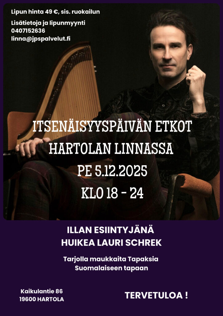 ITSENÄISYYSPÄIVÄN ETKOT LINNASSA 5.12.2025 Vuosien tauon jälkeen Linna täyttyy jälleen musiikista, tunnelmasta ja hyvästä seurasta. Lauri Schrek – monitaituri Tapaksia suomalaisin mauin Baari auki – hyvä tunnelma taattu Pe 5.12. klo 18 | Liput 49 € (sis. ruokailu) Linna, Kaikulantie 86, 19600 Hartola Tule mukaan tekemään tästä uuden aikakauden alku – Linnan juhlat ovat täällä taas!