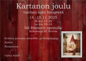 Tervetuloa Itä-Hämeen opiston jouluiseen tapahtumaan! 14.-15.11.2025 pe klo 17- 20 la klo 10-14 Kaikulantie 90, Hartola Erilaisia jouluisia käsityö-ja askartelupajoja, kahvio ja riisipuuroa. TERVETULOA!
