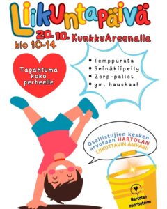 Hartolan nuorisotoimi järjestää koko perheen liikuntapäivän kaikenikäisille KunkkuAreenalla maanantaina 20.10.2025 klo 10-14 temppurata seinäkiipeily ihmispallot (zorb-pallot) ym. hauskaa! Osallistujien kesken arvotaan Hartolan liikuttavin ämpäri! Tervetuloa!