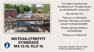 Itä-Hämeen Matkailuyhdistys järjestää kaikille Hartolan, Heinolan ja Sysmän alueen matkailutoimijoille Matkailutreffit maanantaina 13.10.2025 klo 16 alkaen. Tilaisuus on maksuton. Tervetuloa matkailuasioiden äärelle kahvittelemaan ja tutustumaan ennallistettuun Virtaankoskeen (Kymärintie 44, Sysmä). Lisätiedot ja ilmoittautumiset: Itä-Hämeen Matkailuyhdistyksen puheenjohtaja Mia 0400 858596