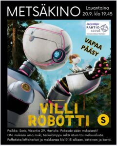 Metsäkino elokuvanäytös avoimen taivaan alla. (Visantie 29, Hartola) Tilauksessa tapahtumalle on hyvä sää, mutta pieni sadekaan ei meitä haittaa. Varustaudu säähän sopivasti. Näihin elokuviin on kaikilla vapaa pääsy!