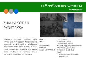 Tervetuloa Itä-Hämeen opiston Sukuni sotilaat kurssille, jossa käsitellään suomalaisen sotaväen historiaa 1500-luvulta aina viime sotiin etenkin Hartolan ja Sysmän alueiden sotilaiden näkökulma huomioiden. 28.-29.11.2025 perjantaina klo 14–19 lauantaina klo 9–15 Itä-Hämeen opisto, Kaikulantie 90, Hartola