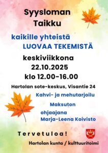 Hartolan kulttuuritoimi tarjoaa sinulle mahdollisuuden luovan taiteiluun syyslomaviikolla. Ota siis suunnaksi Taidetila Taikku keskiviikkona 22.10.2025 klo 12-16. Lämpimästi tervetuloa!