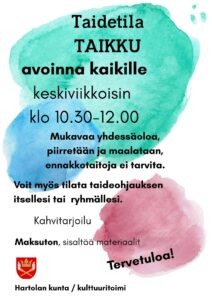 Taidetila Taikulla Hartolan Sote-keskuksen yhteisöllisissä tiloissa pääsee nyt loppuvuoden aikana taiteen ja kulttuurin äärelle ohjatusti keskiviikko aamupäivisin. Ohjaajana toimii Marja-Leena Koivisto. Tervetuloa mukaan! Toiminnan sinulle ja toverillesi tarjoaa Hartolan kulttuuritoimi