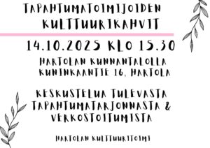 Tervetuloa Hartolan tapahtumatoimijoiden tilaisuuteen. Ei ennakkoilmoittautumista. Etukäteispohdinnat: 044 7432257 / Anna-Maija