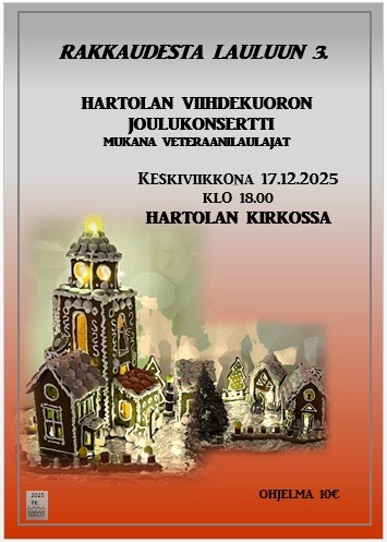 Keskiviikkona 17.12.2025 klo 18.00 Hartolan kirkossa (Keskustie 55, Hartola) Ohjelmistossa tuttuja ja vähän tuntemattomampiakin joululauluja. Mukana veteraanilaulajat. Tervetuloa!
